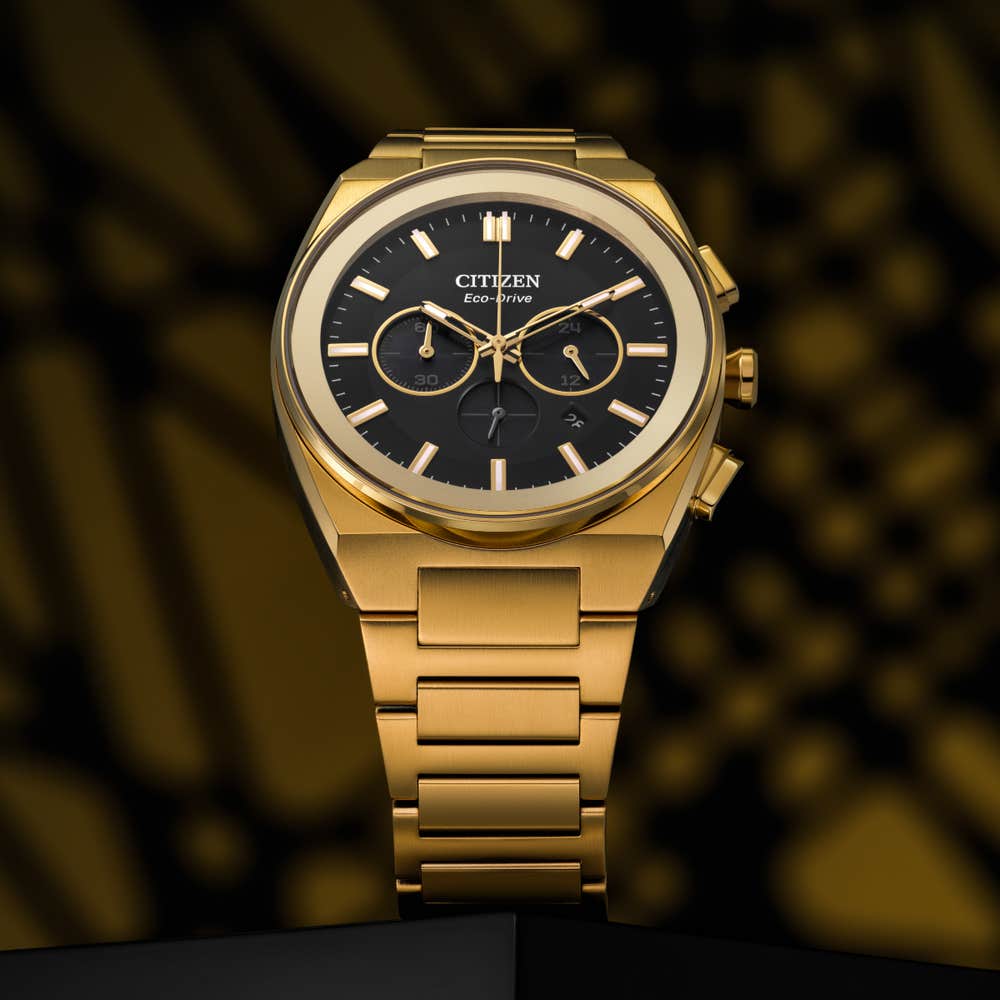 Sporty elegance in full gold-tone stainless steel with Eco-Drive technology.
