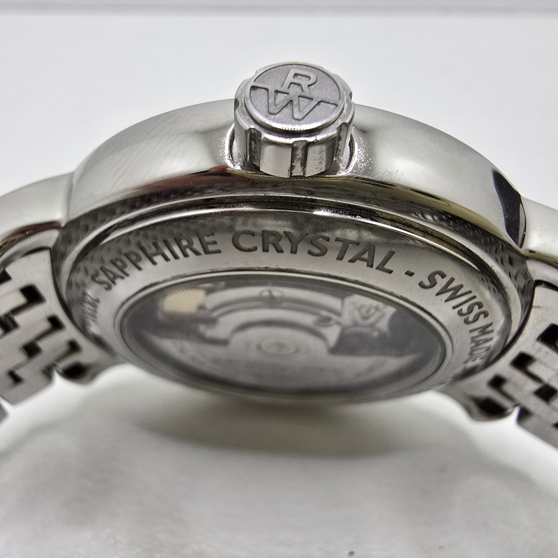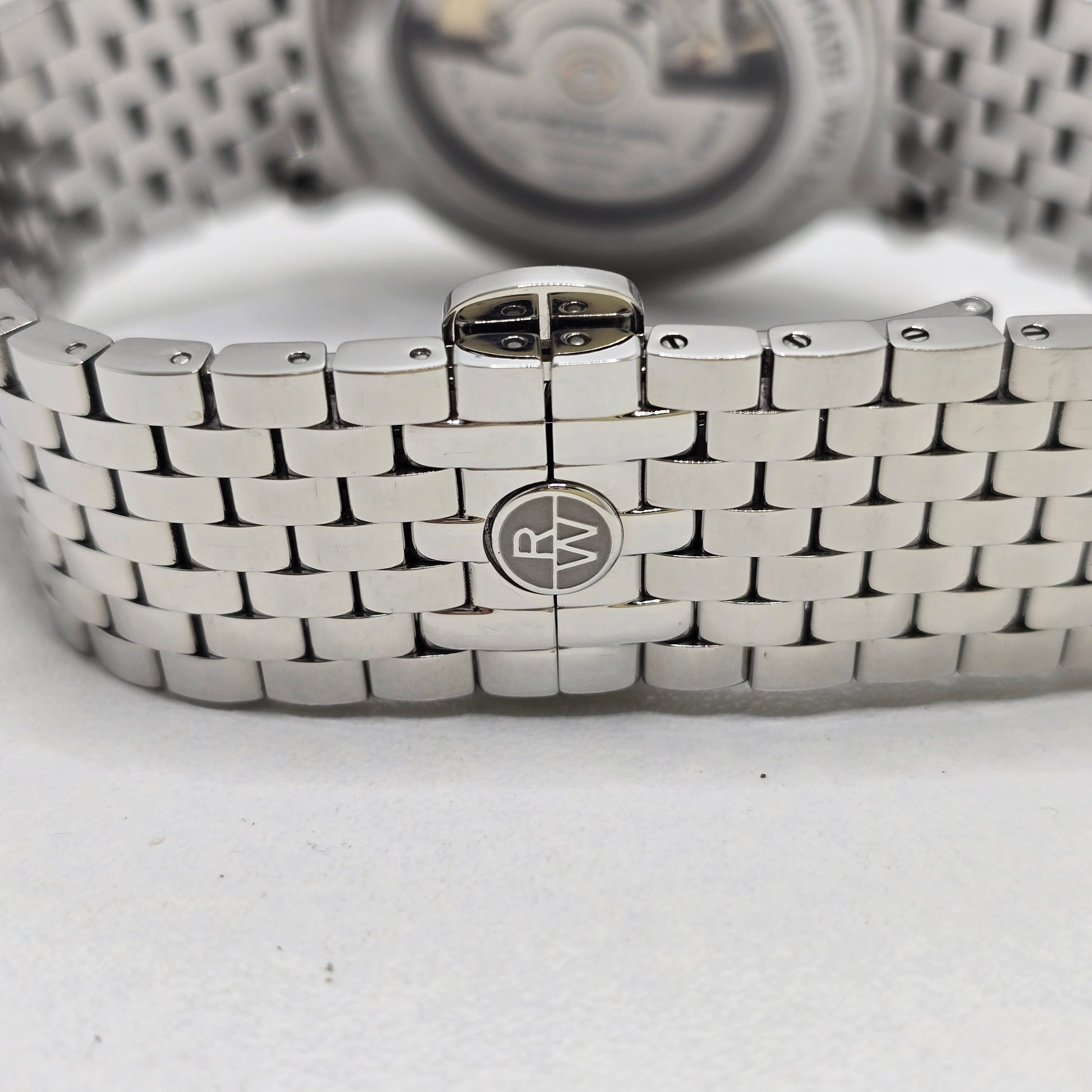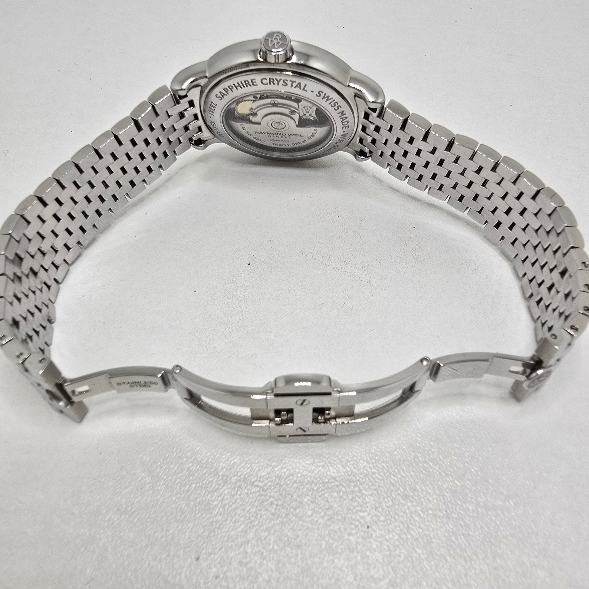A quality used timepiece in excellent condition, hardly worn and complete with full stainless steel bracelet (no links missing). Features a black dial with small seconds, Swiss automatic movement, and classic 39.5 mm case. Supplied with original Raymond Weil box and covered by our 6-month guarantee.