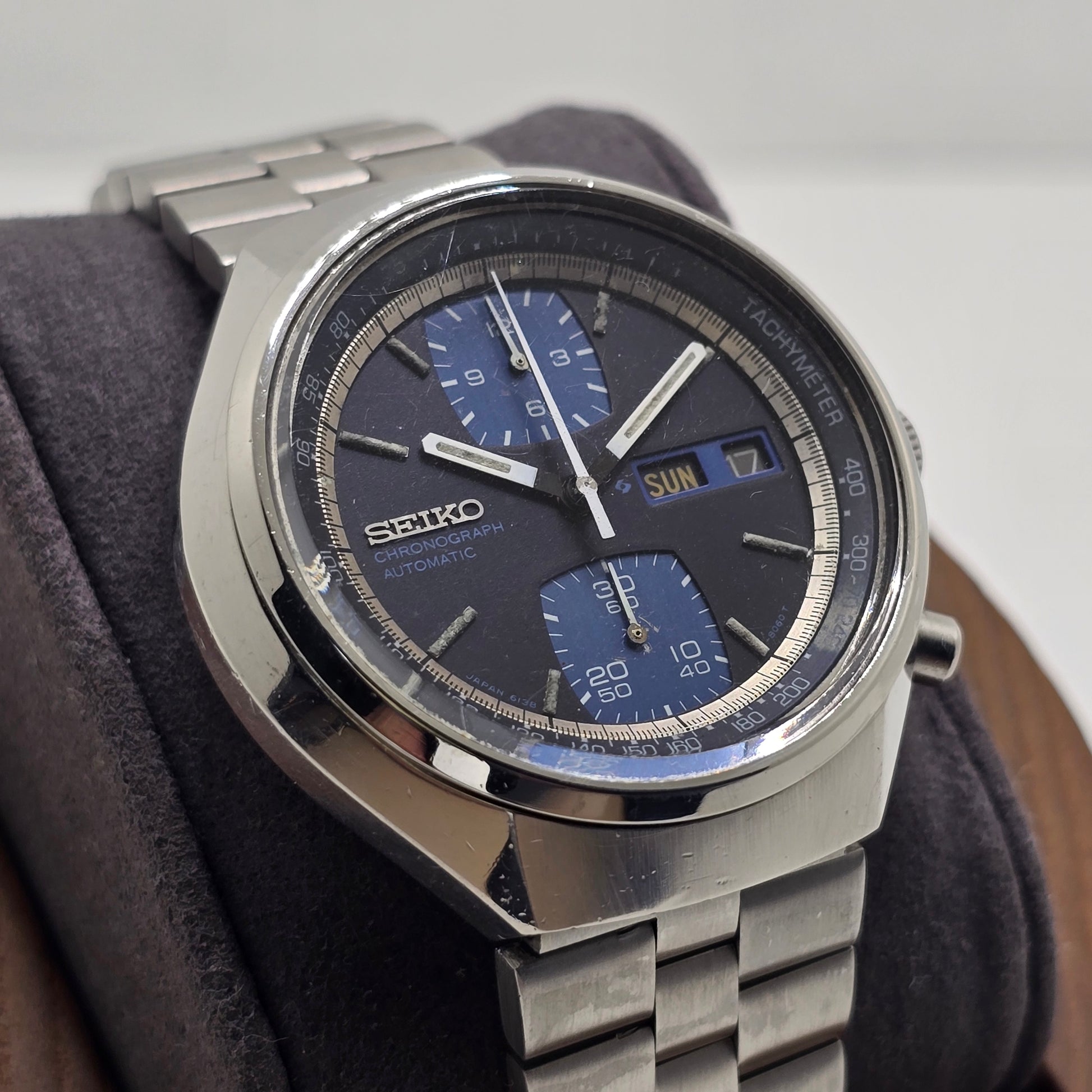 A true icon from Seiko’s golden era, the 6138-8030 represents the charm and character of 1970s mechanical watchmaking. Featuring a striking black dial paired with vivid blue sub-dials, this rare colour combination gives the watch a bold and distinctive presence on the wrist. Collectors often refer to this model as part of the “John Player Special” (JPS) family, inspired by the legendary racing livery of the era — a nod to its motorsport-influenced style and heritage. This model is also known as the Baby Kakume.